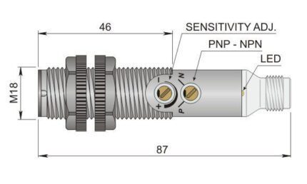 FT18SM-CP50 photo sensor; 10-30DC; M18 metal housing; reflective; axial; 0…500mm; PNP/NPN; NO/NC; dimmer; 2m cable