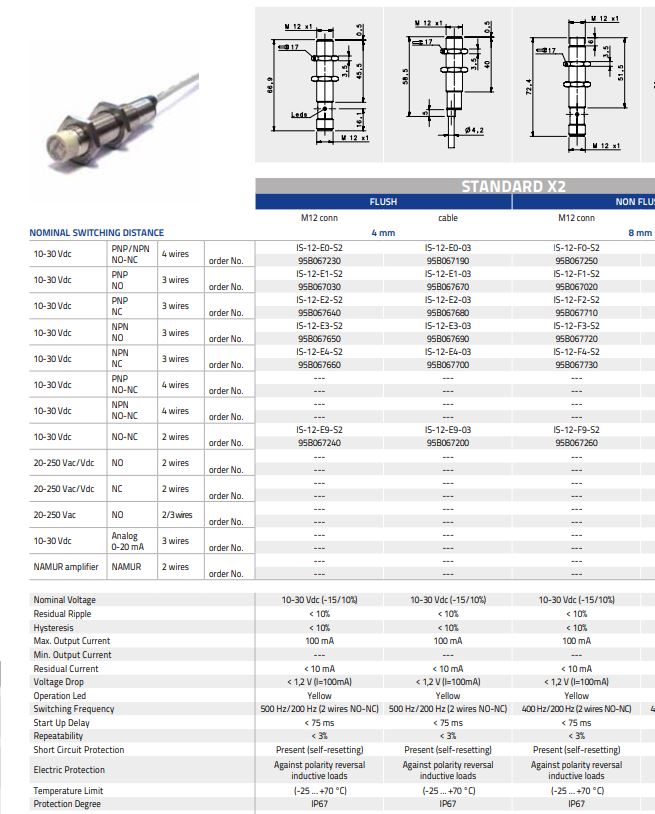 IS-12-F0-S2 Inductive sensor; 10-30DC; “non flush”; standard housing; 8mm; PNP/NPN; NO/NC; M12 connector; IP67