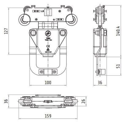 Metal carrier; with one plastic roller; for rope; max Ø18mm for cable