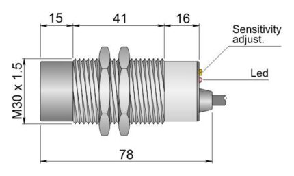 SC30SM-CE25 Capacitance sensor, 10-55DC, M30 metal housing, “non-flush”, 0-25mm, PNP, NO+NC, 3m cable, IP67