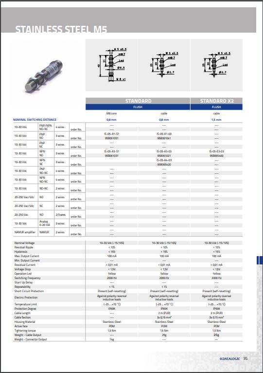 IS-05-A1-03 Индуктивный датчик; 10-30DC; “заподлицо”; стандартный корпус; 0,8 мм; PNP; NO; кабель 2 м; IP67